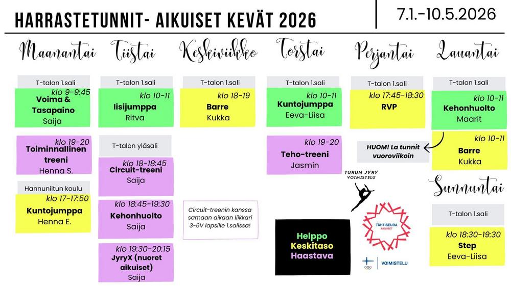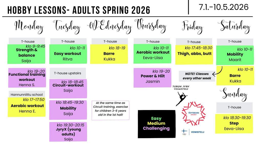 Hiihtolomalla 16.2.-22.2.2026 aikuisten tunnit normaalisti. Lasten, nuorten ja perheliikunnan ryhmät lomailevat (paitsi Liikkari, joka toimii Circuit-treenin lapsiparkkina)