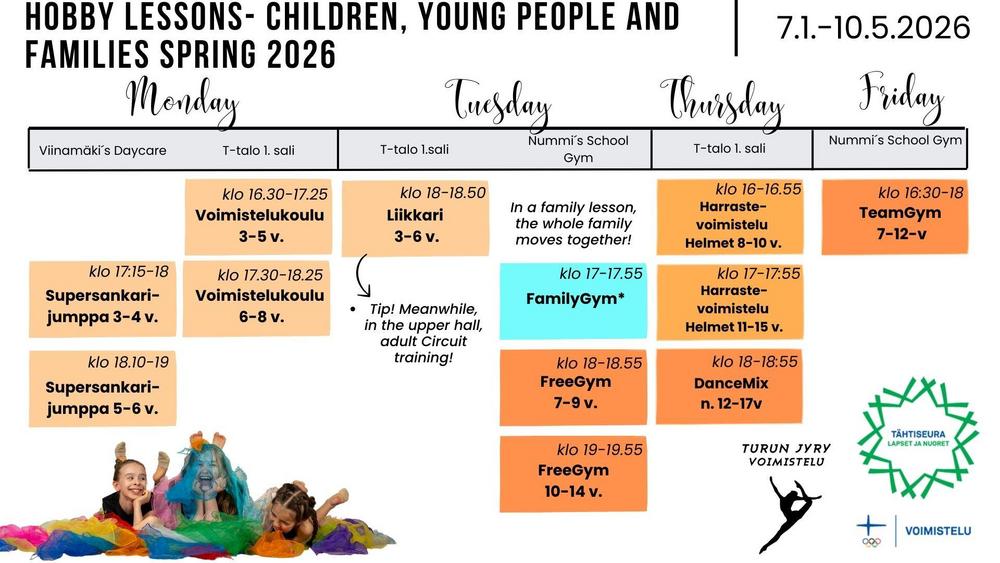 Ryhmäkohtaiset aikataulut ja ilmoittautumiset löydät vasemmalta valikosta.